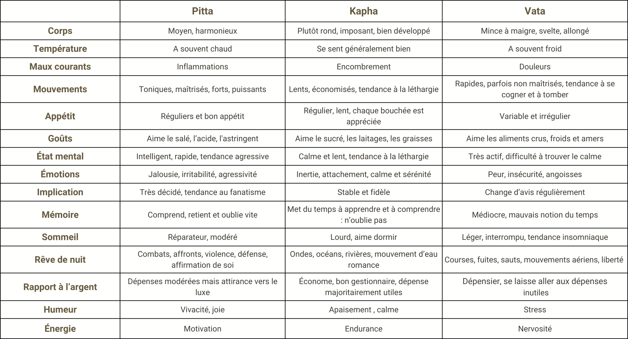 Regarde ces 3 colonnes et essaye de définir ton dosha :